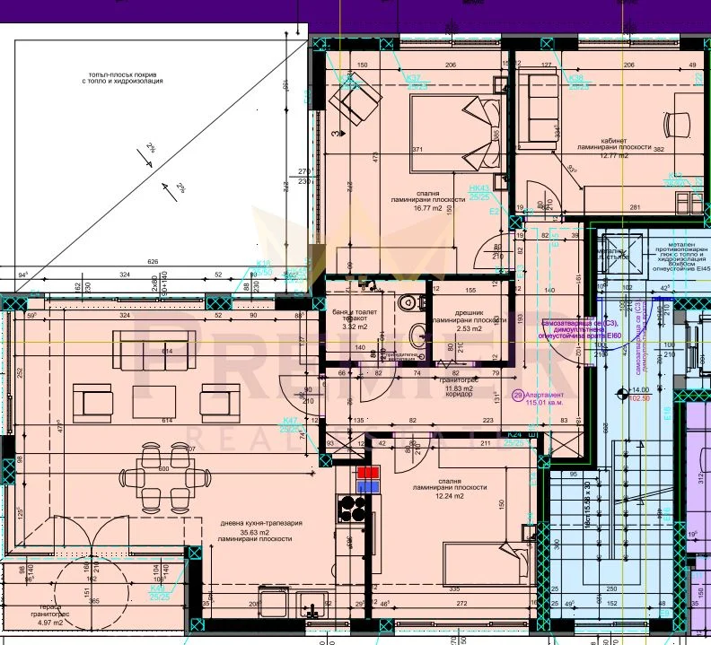 Апартамента е със следното разпределение-коридор-дневна над 30 кв.,три спални,Дрешник,перално помещение ,санитарен възел,две тераси.