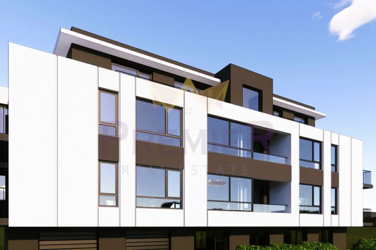Апартаментът се намира на трети етаж от общо четири, в малка новострояща се жилищна сграда с 15 апартамента. Жилището е с площ от 104 кв.м и се състои от входно антре с коридор,всекидневна с кухня, две непреходни спални, баня с тоалетна, санитарно помещение, склад и балкон.Сградата се намира на комуникативно място. Етап на строеж- пред АКТ 14. Има възможност за закупуване на паркомясто- 15000 евро.