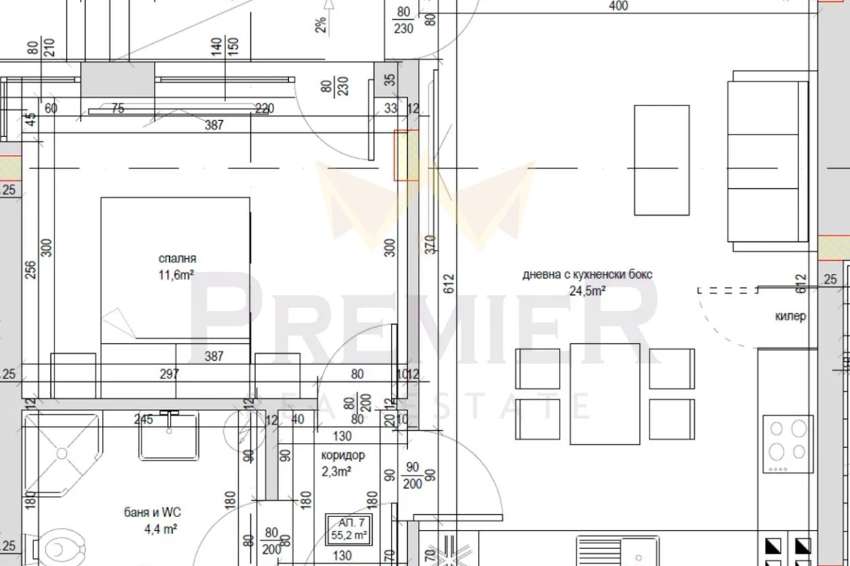 - дневна с кухненска част- 24.5кв./м. с излаз към тераса;