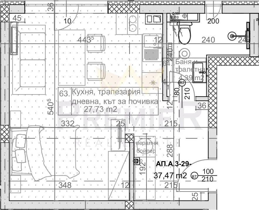 • 🛋️ Светла дневна-спалня с кухненски бокс в едно пространство, позволяващо удобно зониране за релакс, сън и хранене
