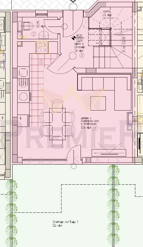 - ПЪРВИ ЕТАЖ – широко входно антре с килер, тоалетна, голяма всекидневна с излаз на собствен двор