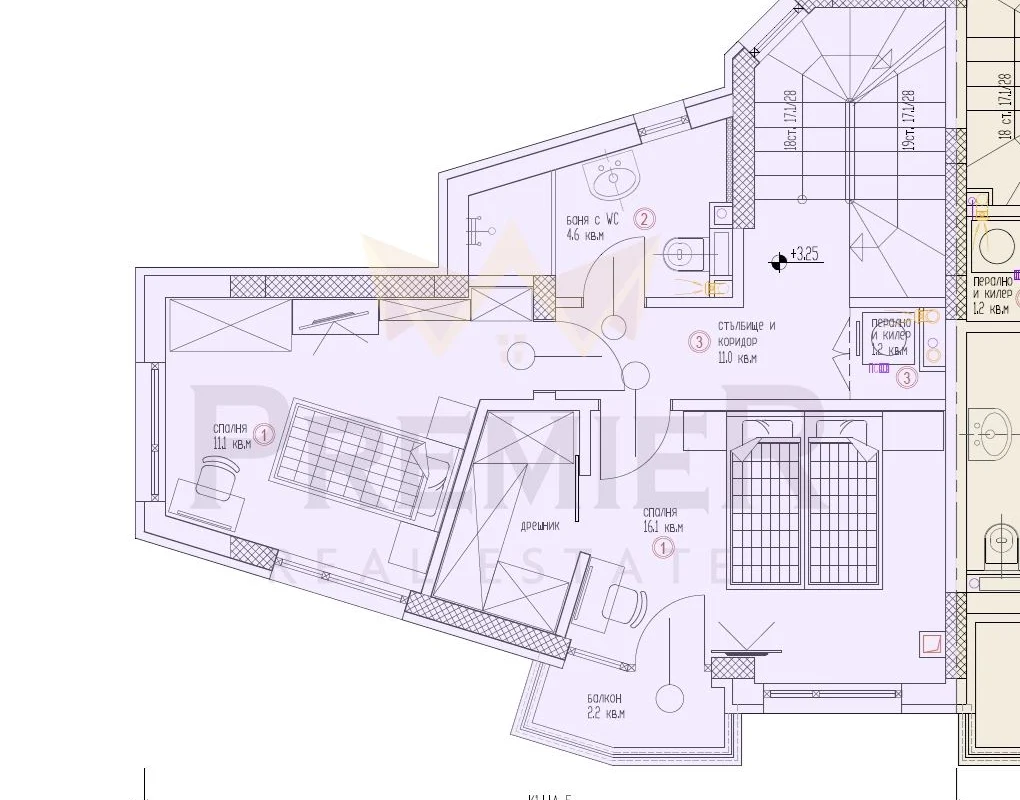 - ТРЕТИ ЕТАЖ – вътрешен коридор, перално/килер, две спални, едната от които със собствен балкон, баня с тоалет за етажа