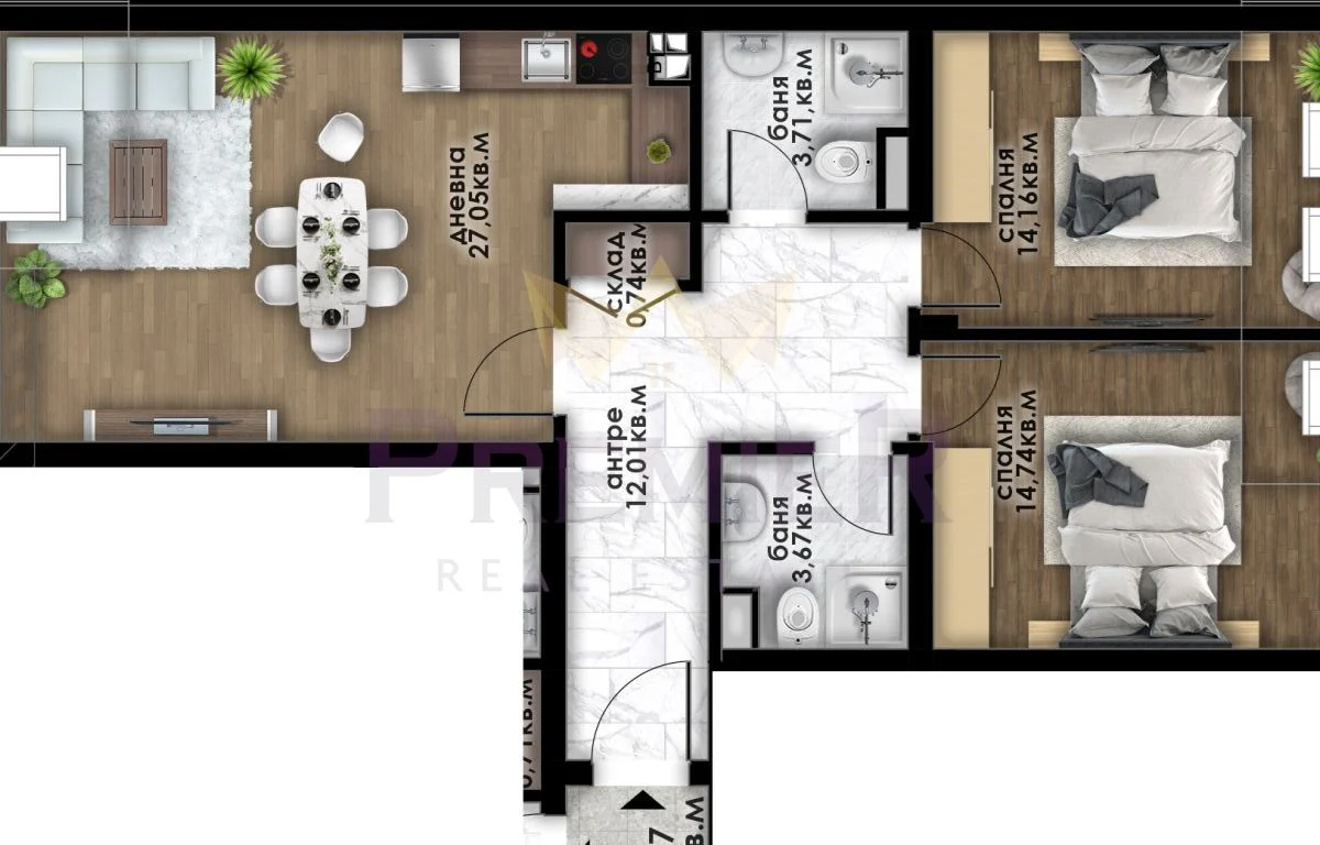Жилището е с функционално разпределение, просторни и светли помещения, създаващи усещане за комфорт и уют. Дневна, две спални, две бани, тераса.
