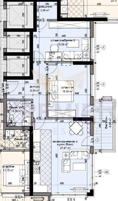 • Светла и уютна всекидневна с площ от 28 кв.м, място за кухненски бокс и трапезария