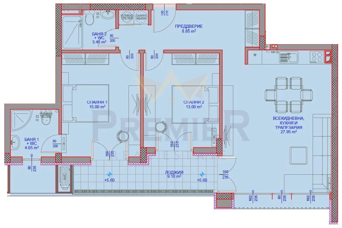 - Просторна всекидневна с кухня и трапезария – 27.95 кв.м