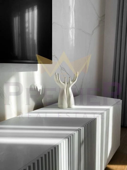 - Дневен тракт с кухненски бокс – светъл и просторен, обзаведен с комфортна мека мебел и обособен кът за хранене. Кухненският бокс е напълно оборудван с всички необходими електроуреди, включително готварска печка, хладилник и пералня, осигуряващ пълно удобство за домакинството.