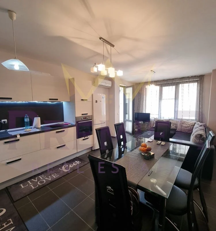 Имоти Премиер предлага на Вашето внимание тристаен луксозно обзаведен апартамент разположен на трети етаж в нова сграда с отлично поддържани общи части, паркинг и зелени площи.Предлага се напълно обзаведен и оборудван. На разположение на наемателите са детска площадка, басейни, барбекю, игрище, фитнес, денонощна охрана.