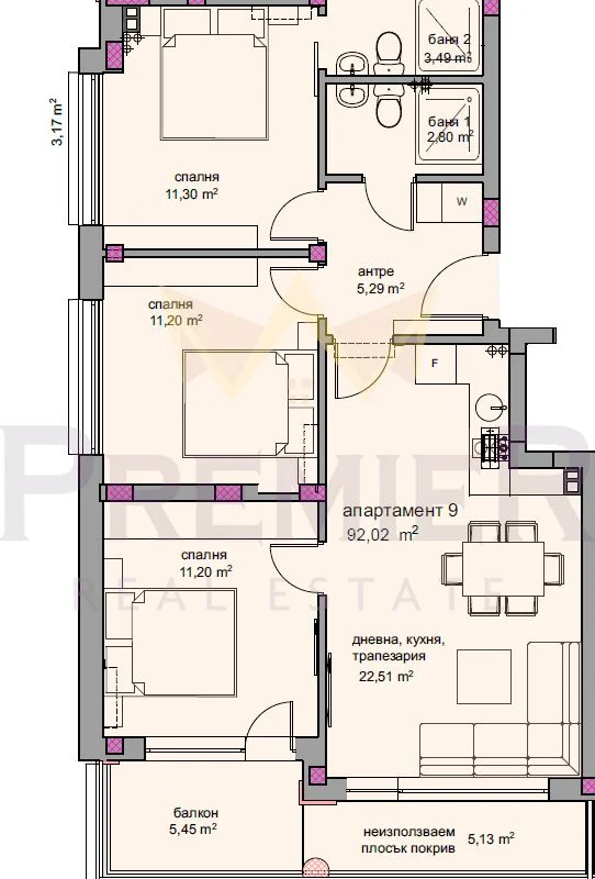 Апартаментът е с обща площ 122.7 кв.м и се състои от входно антре, баня с тоалетна, дневна с кухненска част, три спални като едната е със собствен санитарен възел, тераса от 5.45 кв.м и земя от 38.51 кв.м.