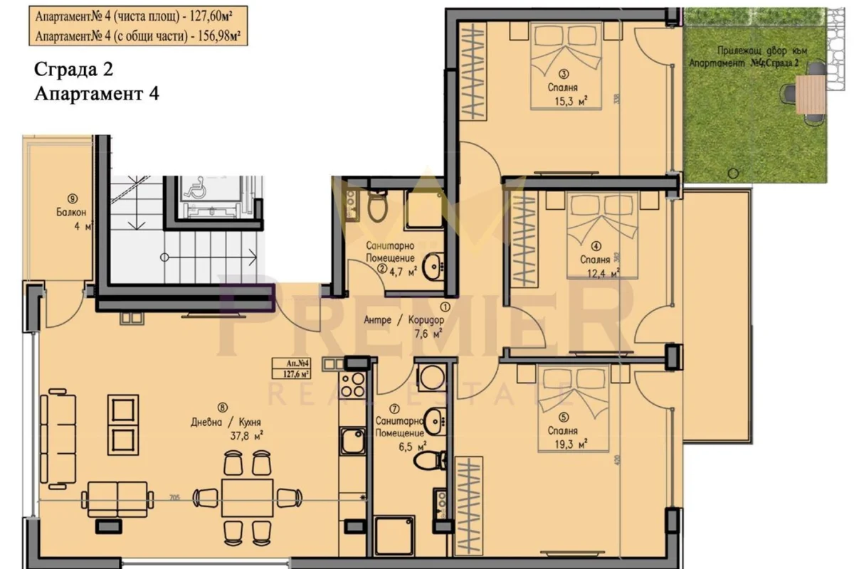 Имоти Премиер предлага четиристаен апартамент с три спални, две бани, дневна с кухня и трапезария, двор и два балкона.