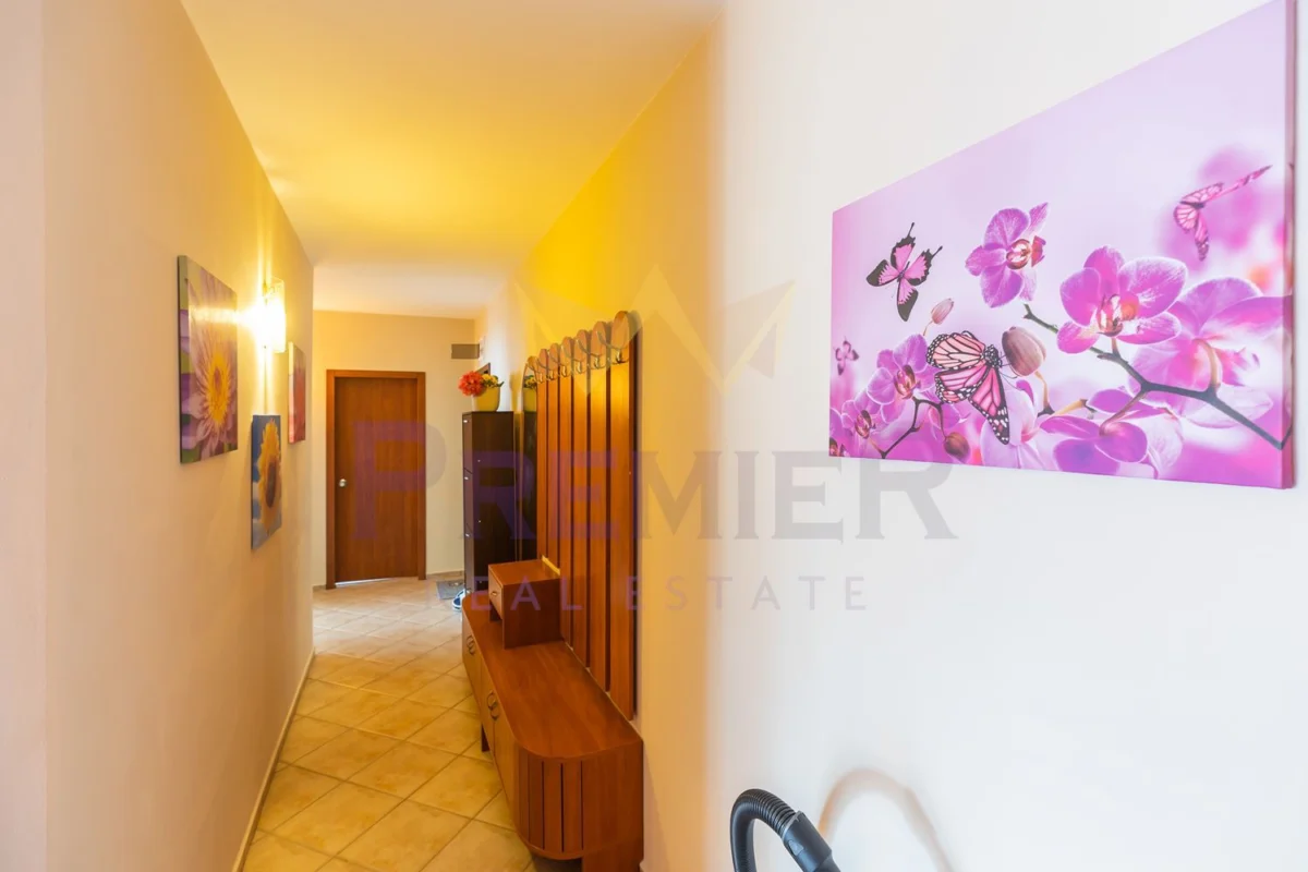 Апартаментът се предлага напълно обзаведен и има следното разпределение, Просторна дневна с трапезария, три спални, баня с тоалетна, отделно тоалетна, две големи тераси.