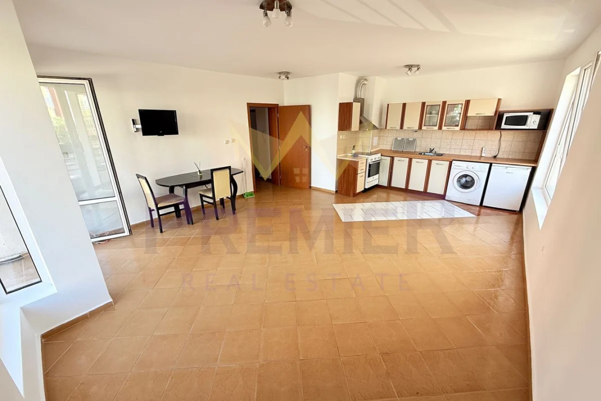 Имоти Премиер предлага на Вашето внимание просторен и обзаведен двустаен апартамент, разположен в жилищна сграда „Солис“, к.к. Слънчев бряг.