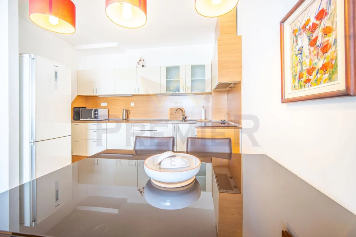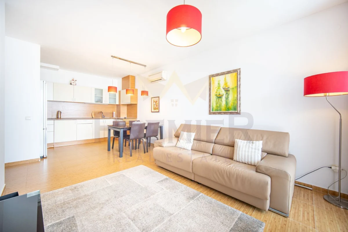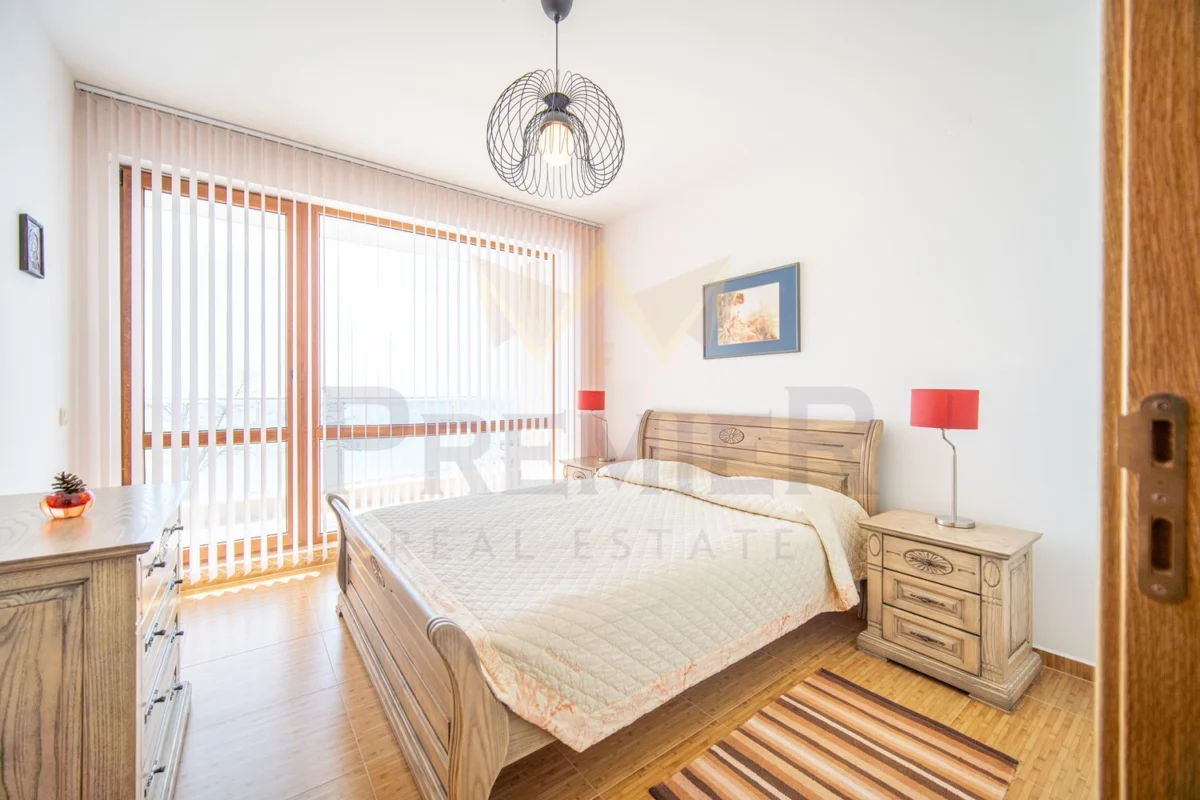 Жилището впечатлява с просторна и светла дневна с кухненска част и трапезария, решена в топли, модерни тонове, с излаз към широка панорамна тераса, от която се открива нескриваема гледка към морето – сцена, която се променя с всяка минута като жива картина.