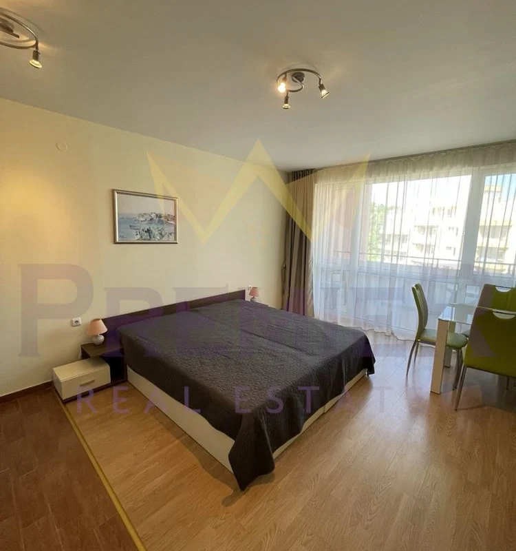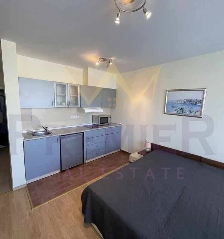 Имоти Премиер предлага на Вашето внимание просторен, напълно обзаведен едностаен апартамент на ПЪРВА ЛИНИЯ МОРЕ в престижния комплекс „Ривиера Форт Бийч“ (Riviera Fort Beach), с. Равда.