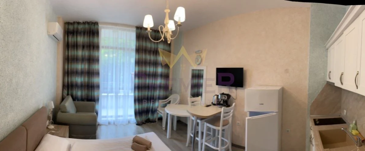 Студиата са с N:3, N:5 и N:8. Всяко от тях е с площ 38 кв.м, напълно обзаведени с всички удобства и тераса към тях. Помещенията са с обновени бани ( микроцимент) преди началото на сезон 2023г.