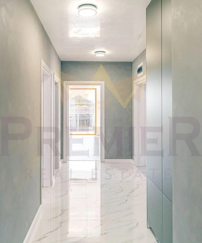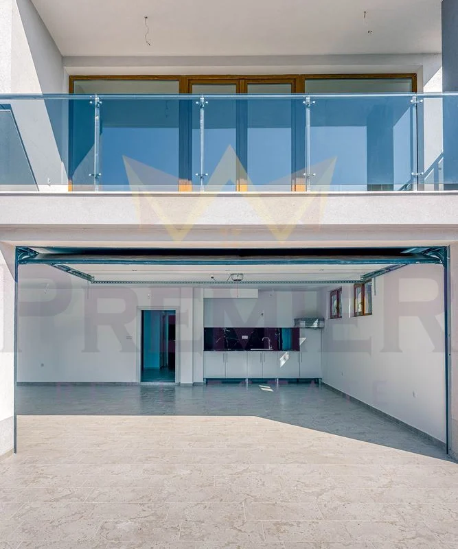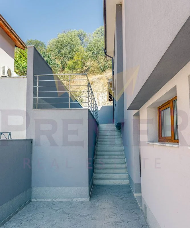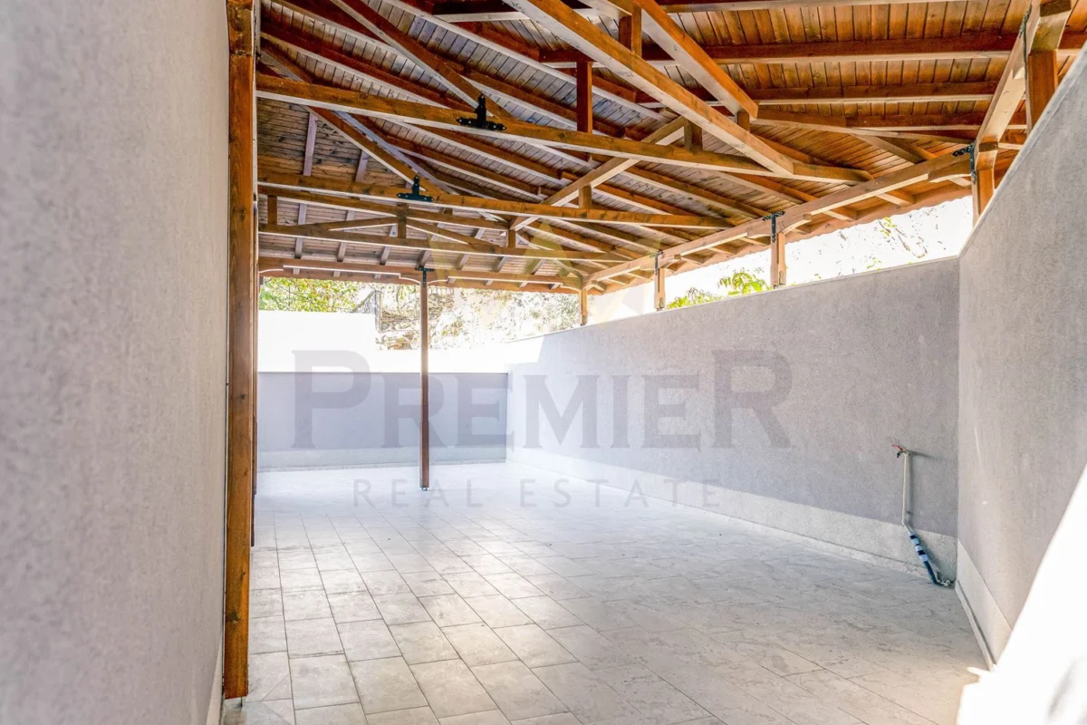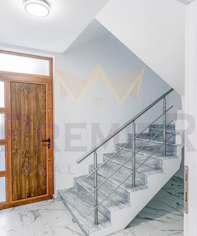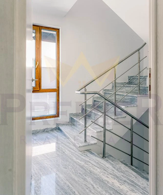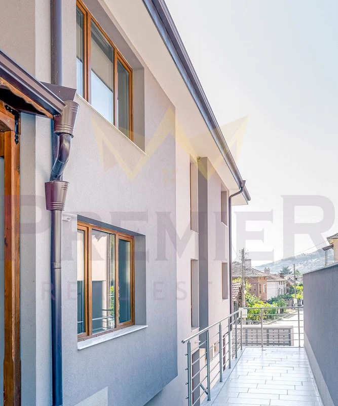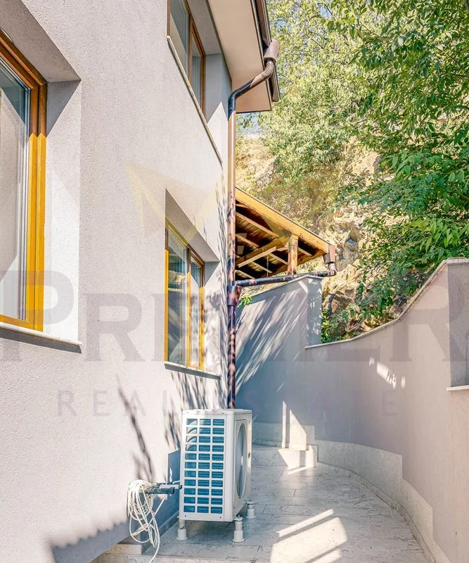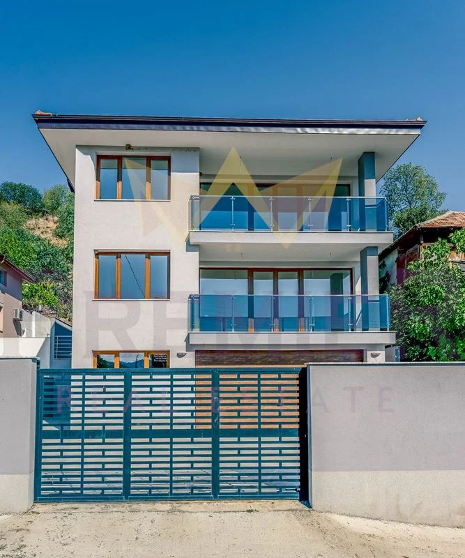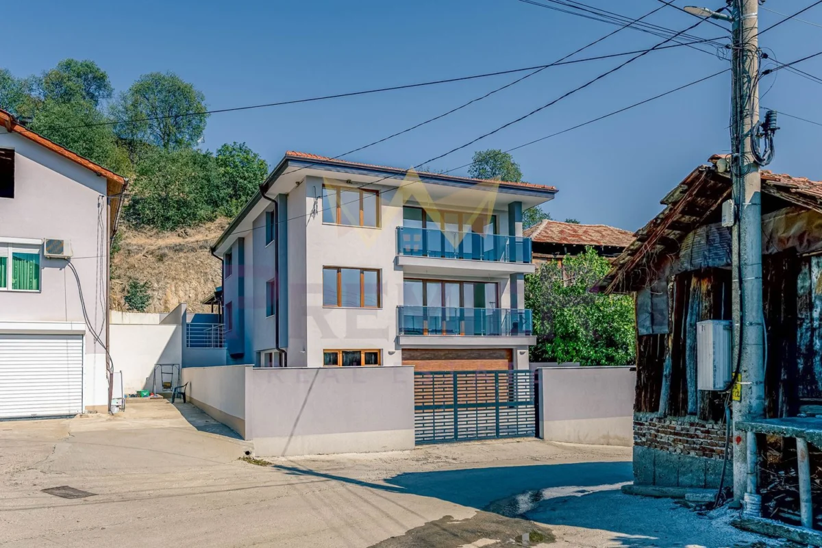 Къщата е изградена върху парцел от 460 кв.м и впечатлява с внимание към всеки детайл и използвани висококачествени материали. Масивна ограда обхваща целия имот, а входът е с модерна автоматизирана врата с дистанционно управление. Гаражът е оборудван с ролетна щора с размери 4х3 м, осигуряваща удобен и сигурен достъп. Фасадата е завършена с ПВЦ дограма Salamander от най-висок клас и елегантни стъклени парапети. Дворното пространство е изцяло облицовано с гранитогрес за максимално лесна поддръжка, а верандата предлага възможности за барбекю зона, открит бар или джакузи. Вътрешното стълбище е изпълнено от естествен камък с иноксови парапети, а отоплението е решено с модерна термопомпа. От имота се разкриват впечатляващи панорамни гледки, които създават усещане за простор и хармония с природата.