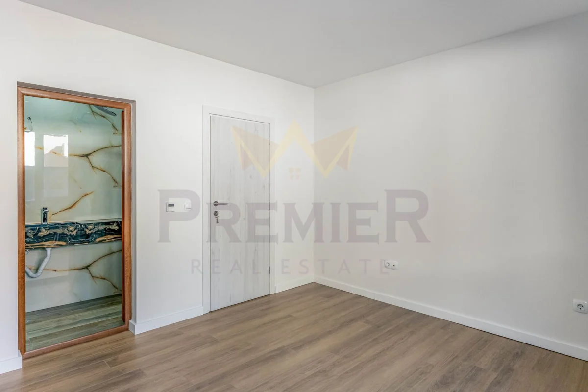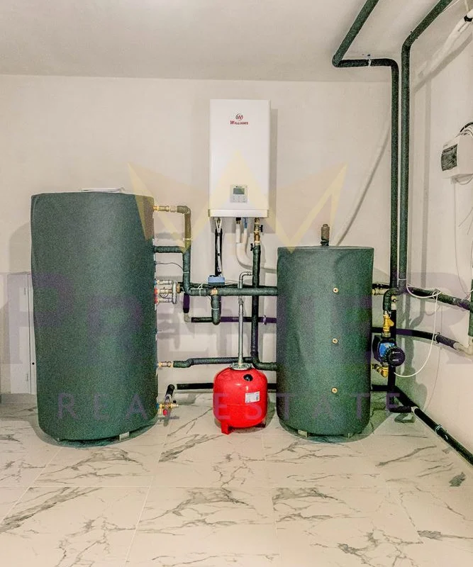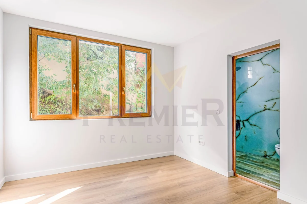 - Първо ниво: Просторно дворно пространство с гараж, оборудван с ролетна щора (4х3 м), обособен работен кът с мивка за удобство при дейности в двора, всекидневна с кухненска част, баня с тоалетна и сервизно помещение с модерна термопомпа, обслужваща отоплението и охлаждането на целия имот.