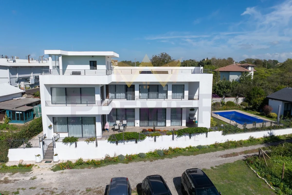 Tази къща предлага зашеметяваща нескриваема морска панорама от всеки етаж . Архитектурата е модерна и минималистична, с изчистени линии и големи стъклени фасади, които отварят интериора към морето и небето. Къщата е с плосък покрив върху който е изградена огромна тераса от 109 кв.м с уникална морска панорама .Къщата разполага с огромна трапезария с кухненски бокс от 109 кв.м , две просторни спални , една кино зала която може да бъде превърната в голяма спалня , три санитарни помещения , една самостоятелна отделна малка къща с рзп от 45 кв.м ,голям басейн , парко места ,хидрофорна система ,соларна система, и други екстри