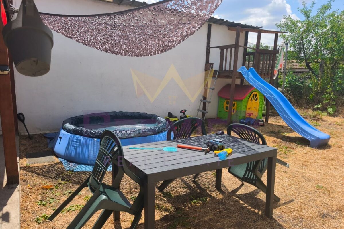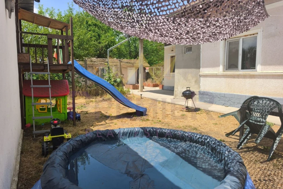 Площа на парцела е 1000 кв.м. Състои се от дневен тракт в който е оборудван с нова кухня,