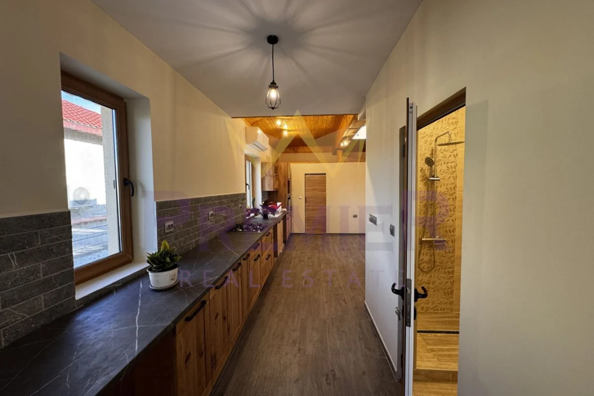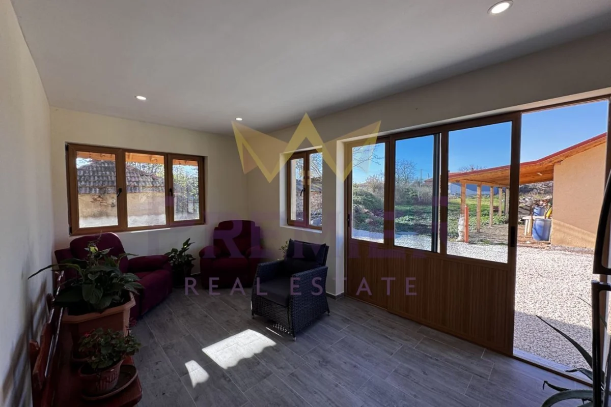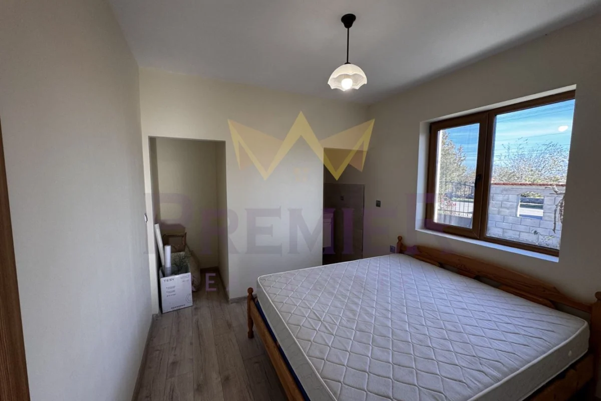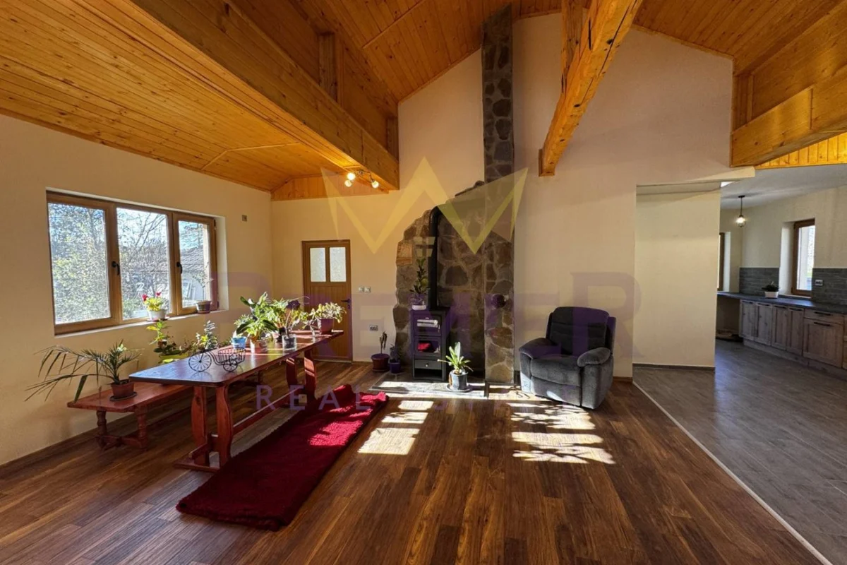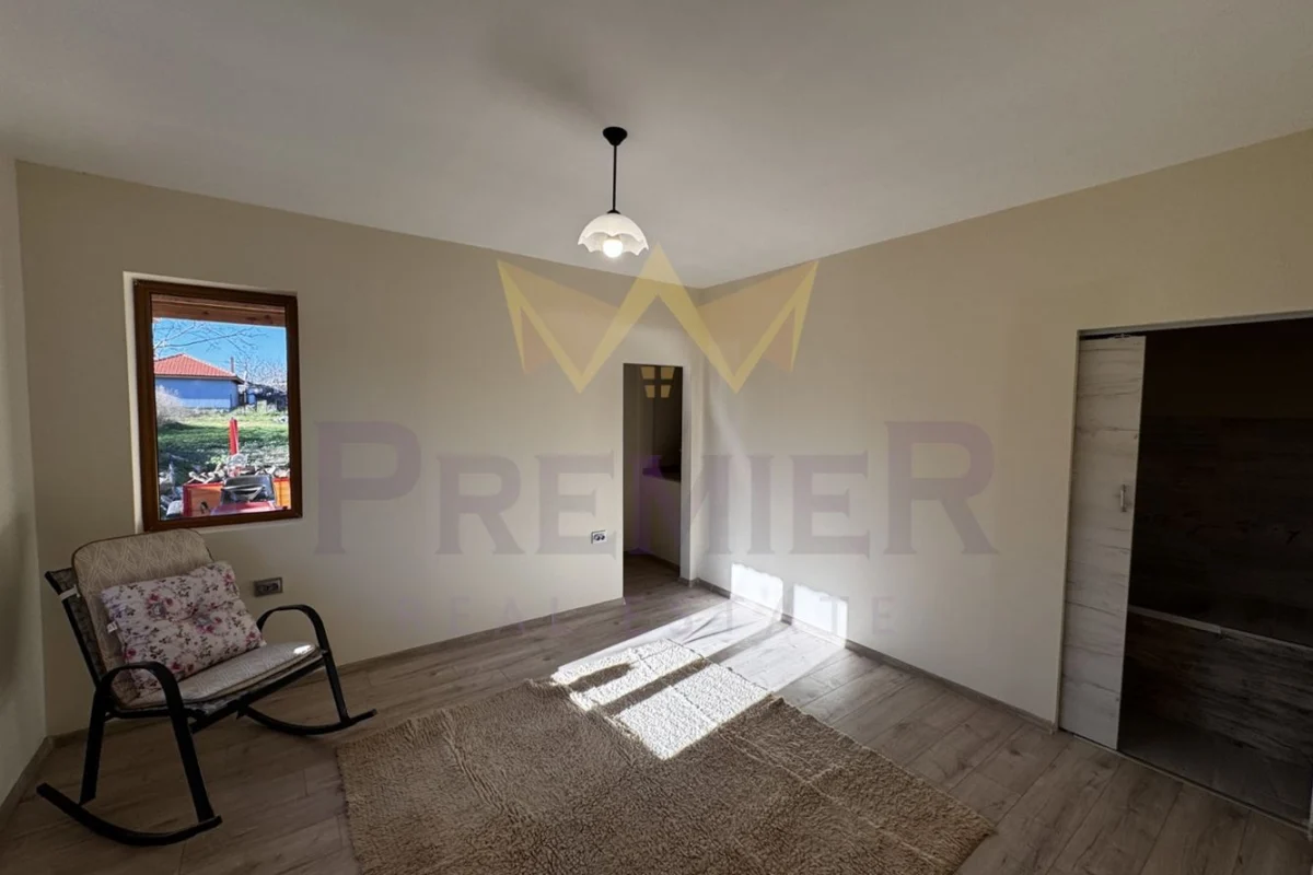 Имоти Премиер представя на Вашето внимание новопостроена просторна къща, с двор 2,4дка. С общо 160 кв.м., домът предлага достатъчно пространство за вас и вашето семейство. Разпределението е както следва: антре, голям дневен тракт с кухня, високи 9 метра тавани в хола, килер, баня с тоалет, главна спалня с баня и тоалет, спалня, спалня с тоалет и гардеробна, остъклена тераса. 60 кв.м. гараж с навес, като в гаража има климатик, бар, хладилник. В двора има стопански постройки и къщичка за реновиране. Имотът е ограден с масивна ограда.