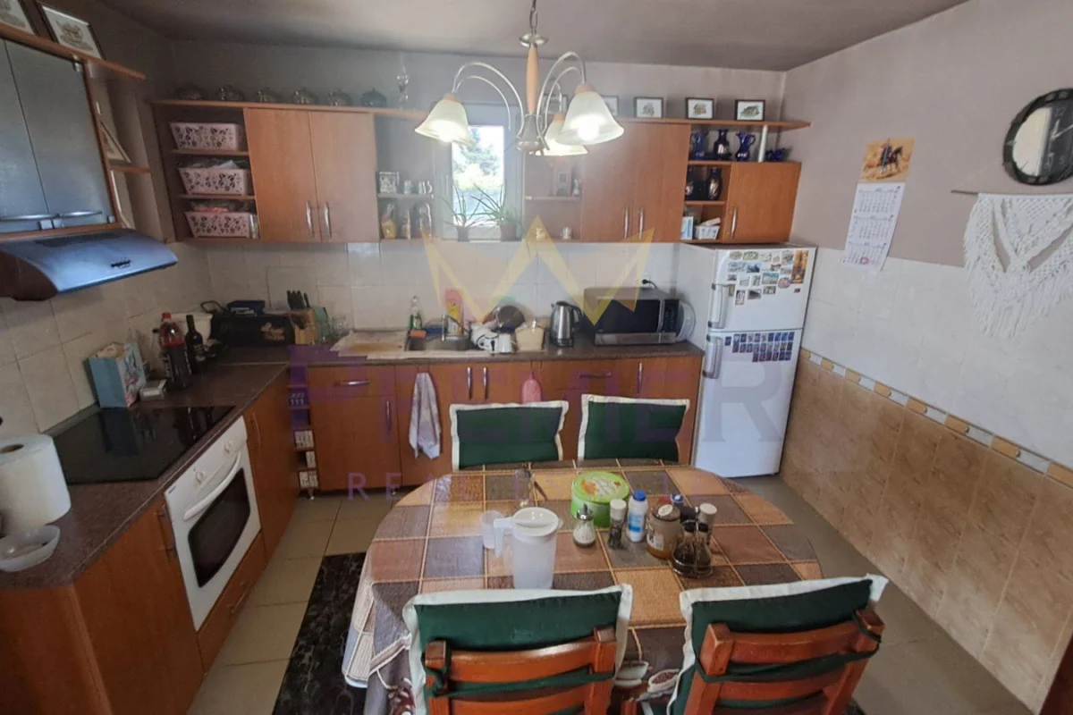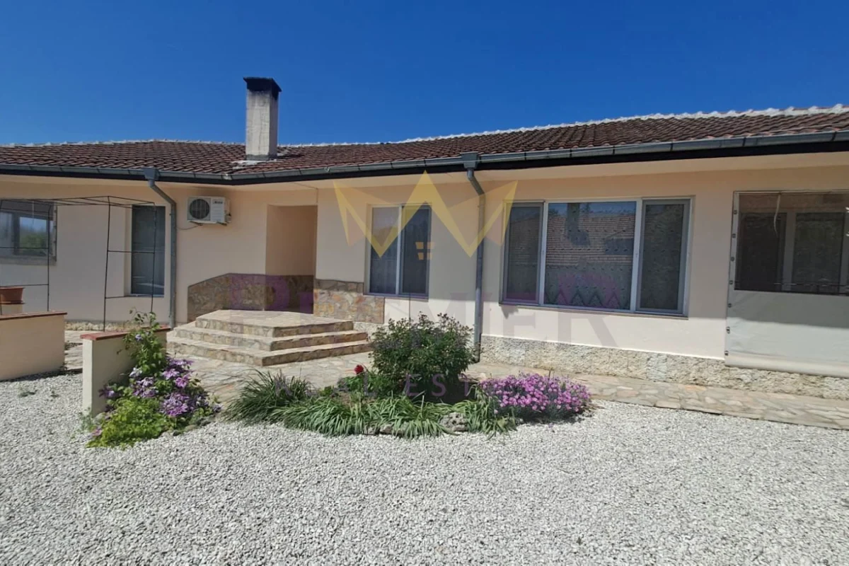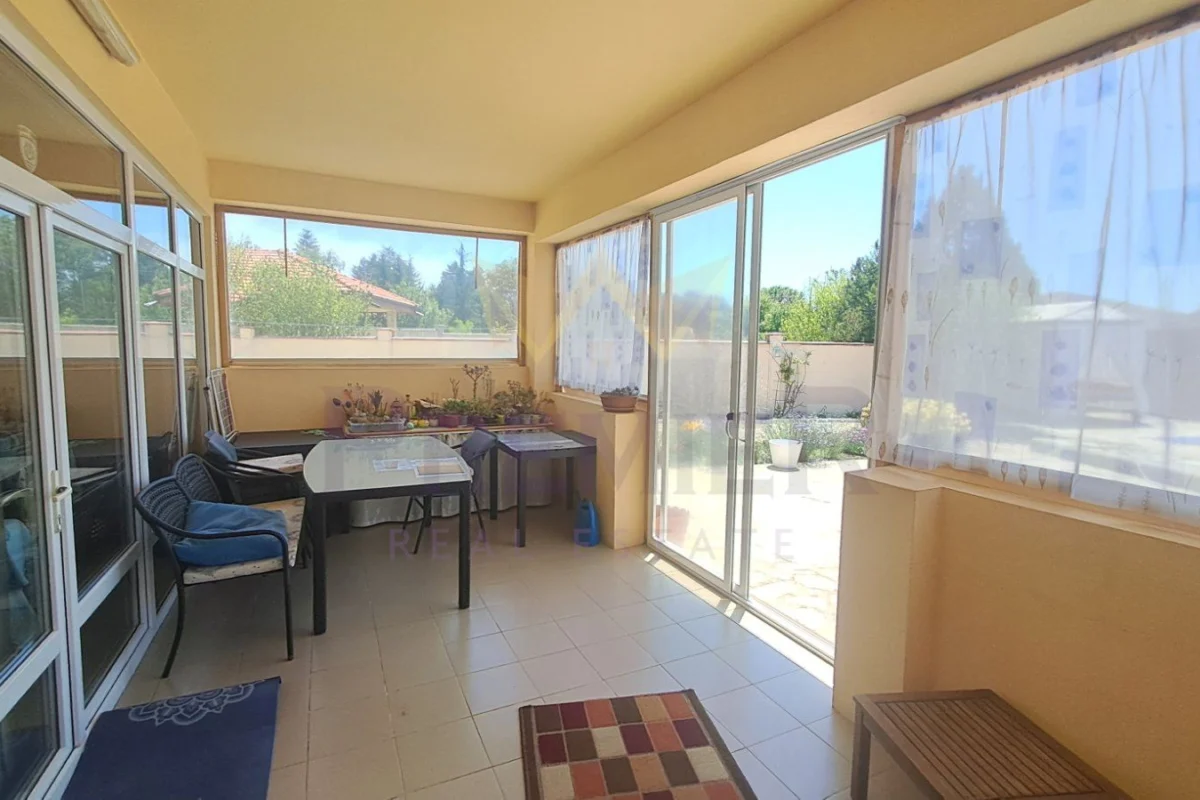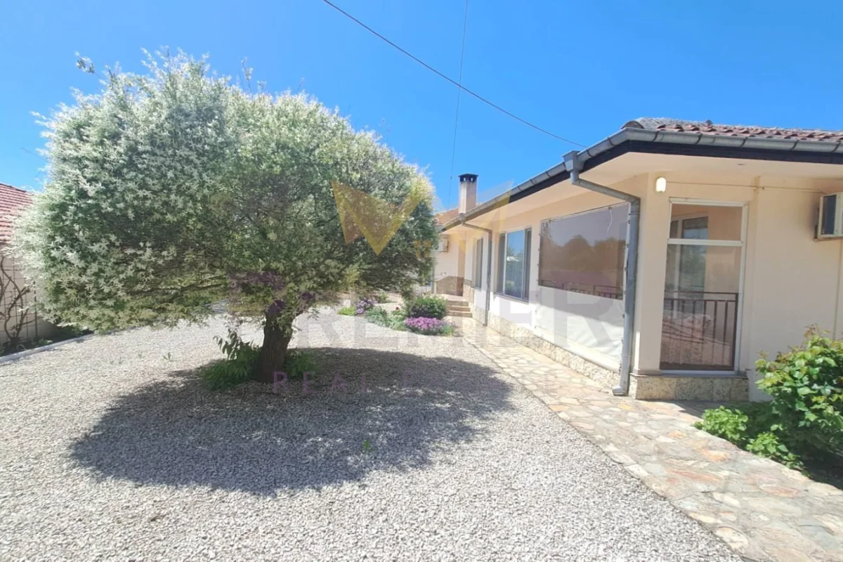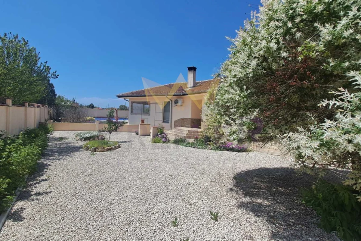Къщата е със застроена площ от 186 кв.м.и се състои от всекидневна с кухня и трапезна зона с излаз на просторна закрита ведранда, коридор, 3 спални, перално помещение,килер,гардеробна към една от спалните, 2 комбинирани санитарни помещения, втора по малка веранда ,обособена като лятна кухня. Къщата се продава с наличното обзавеждане и оборудване, напълно готова за нанасяне.
