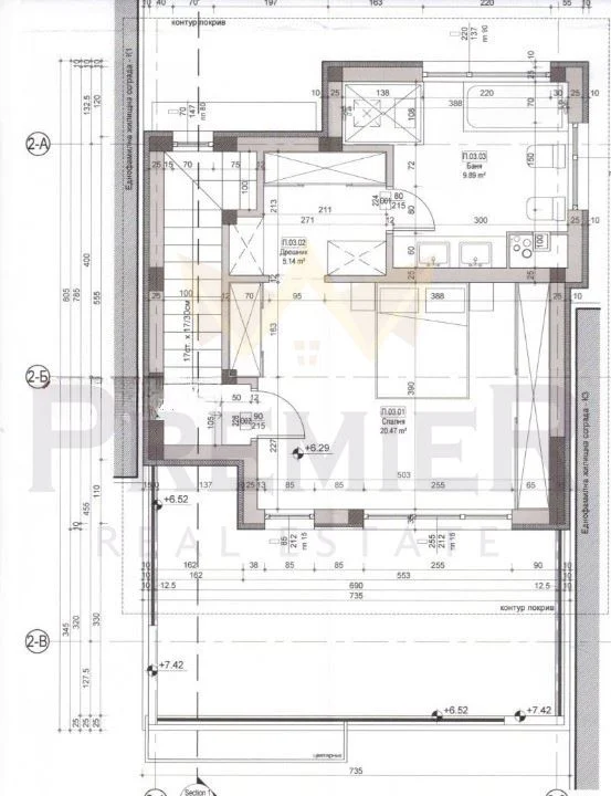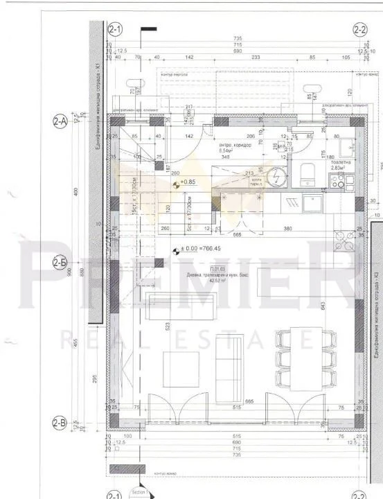 - Партер- входно антре със стълбище към етажите, всекидневна с трапезария и кухненски бокс, тоалетна;