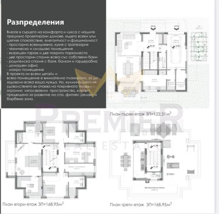 - 1 етаж – гараж за една кола плюс две паркоместа, техническо помещение и складово помещение, входно антре, прсторна всекидневна с кухненски бокс и трапезария