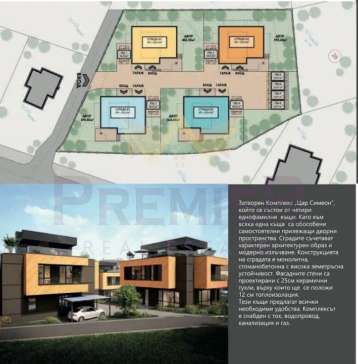 Къщата се намира в затворен комплекс, който се състои от четири еднофамилни къщи като към всяка има обособени самостоятелни дворни пространства от 500 кв.м.