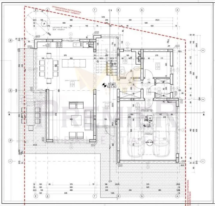 Първи етаж – двоен гараж, сервизно помещение, голям хол с кухня и трапезария, баня с тоалетна.