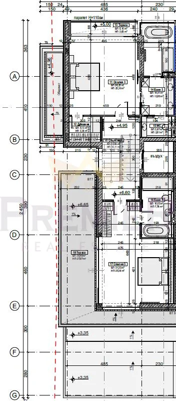 Втори етаж: спалня с дрешник, баня с тоалетна, тераса; втора спалня с баня и тоалетна и тераса към нея.