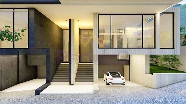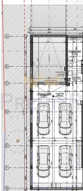 Сутерен: Гараж за четири автомобила, помещение за газов котел с термопомпа, зарядна станция.