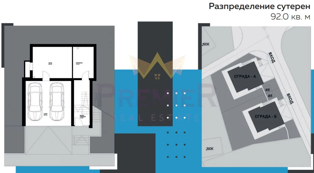 Сутеренът е 92 кв.м и включва гараж, склад и едно техническо помещение.