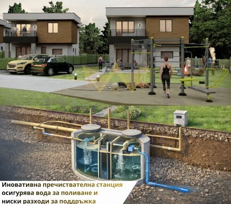 - Собствена пречиствателна станция – без миризми, шум и с възможност за автоматична поливна система