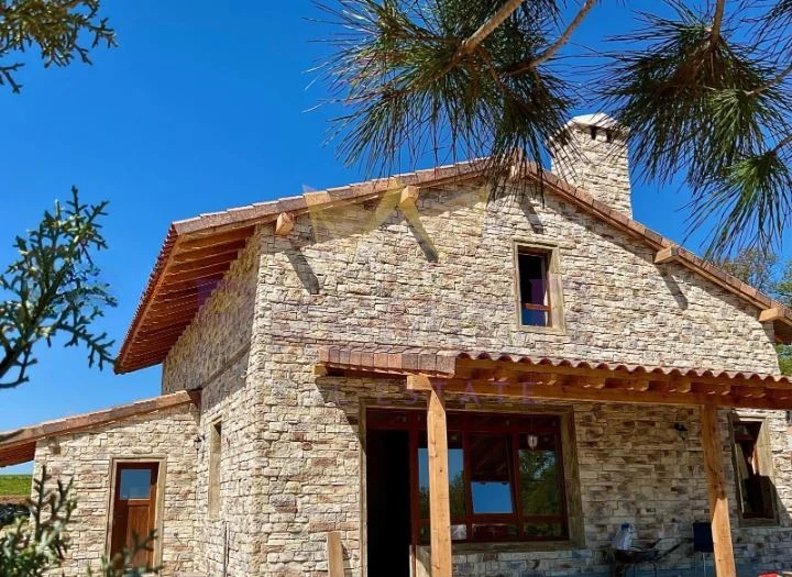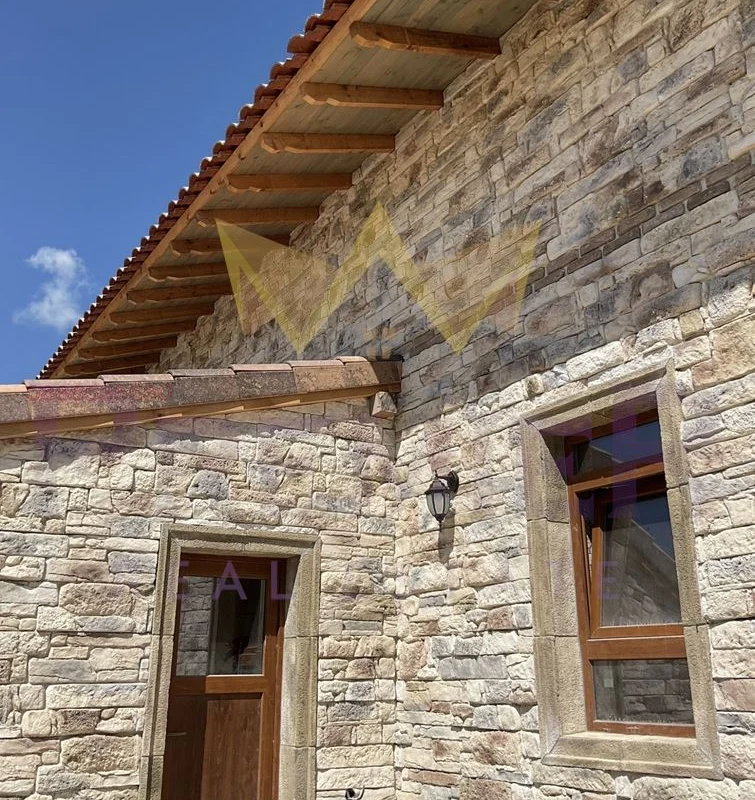 • Материали и изпълнение: дограма Salamander с двоен стъклопакет; капандури Velux; покрив с клинкерни керемиди Tejas Borja; висок клас топлоизолация; фасадна облицовка от декоративен камък
