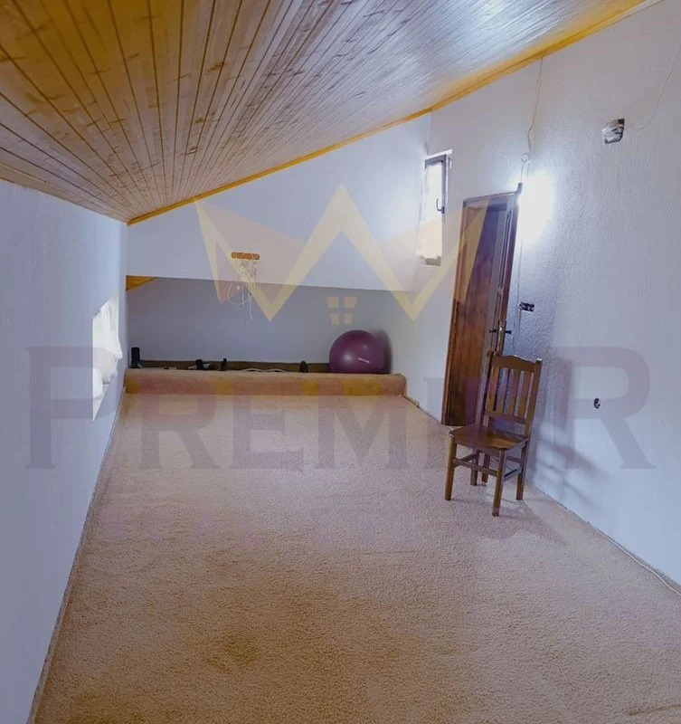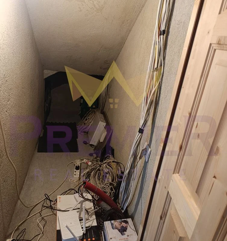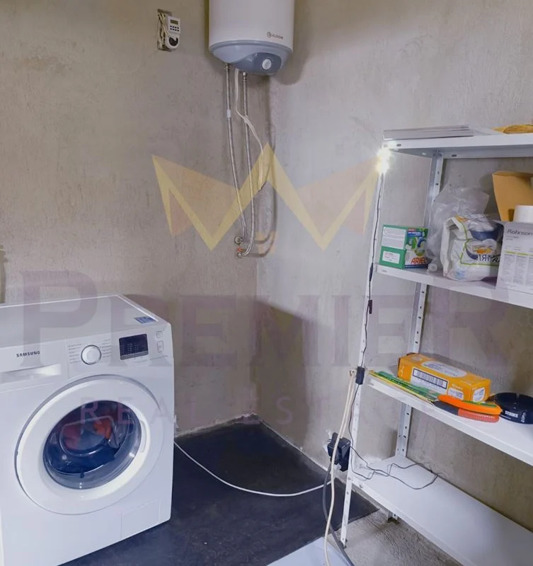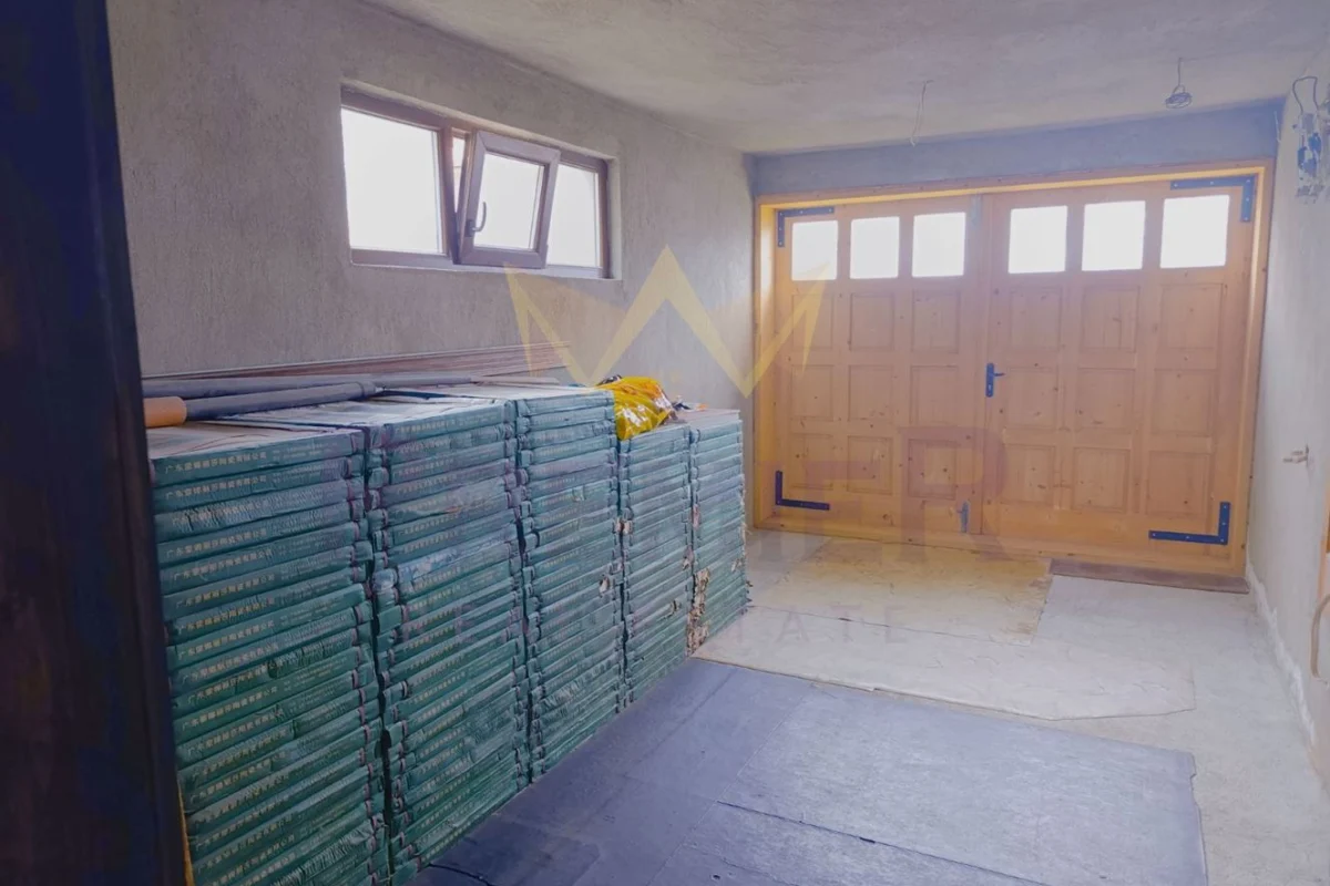 На първия етаж ви очакват предверие, коридор, слънчева дневна с кухня, комбинирано санитарно помещение и практично подстълбищно пространство, оборудвано с домашна автоматизация. Гаражът с топла връзка предоставя удобство и сигурност, а наличните складови помещения добавят допълнителна функционалност.