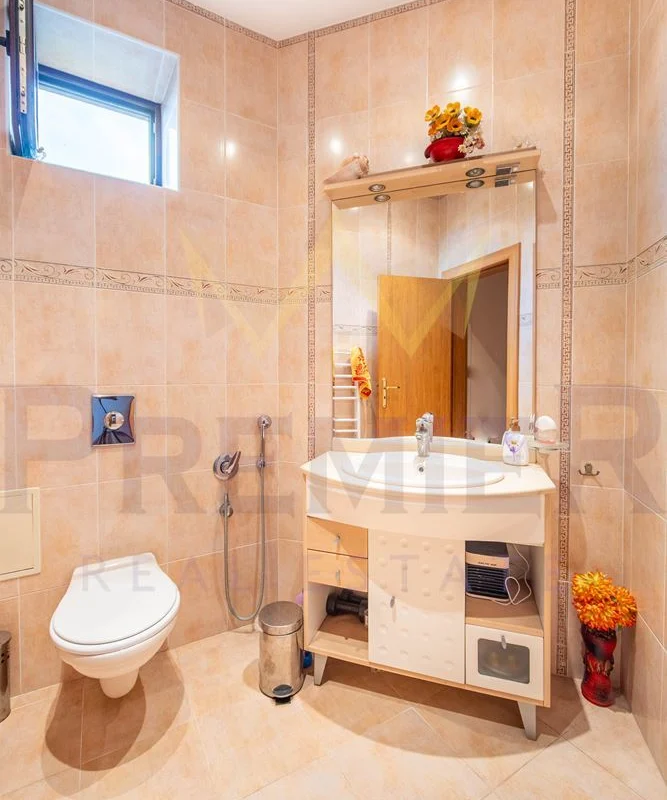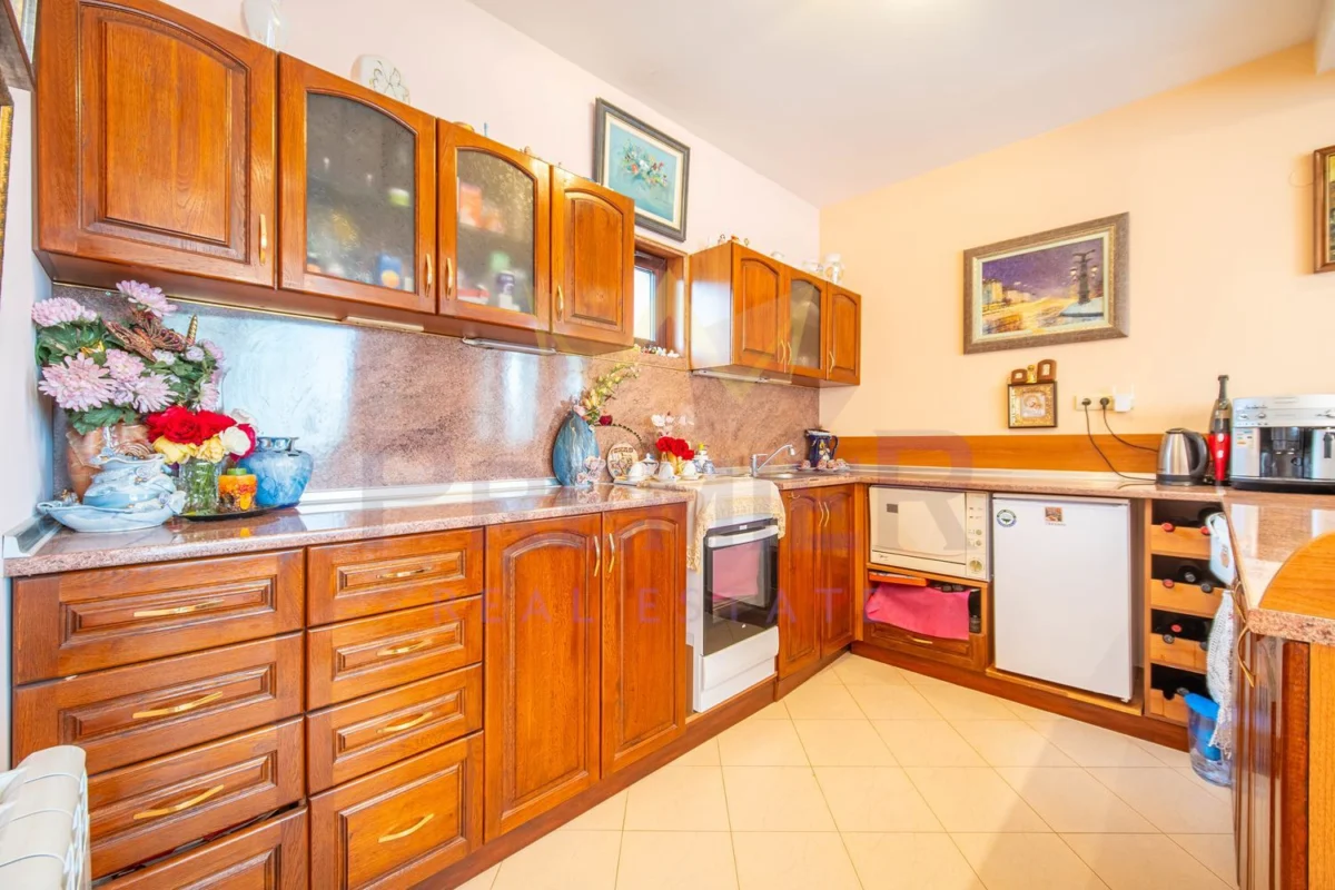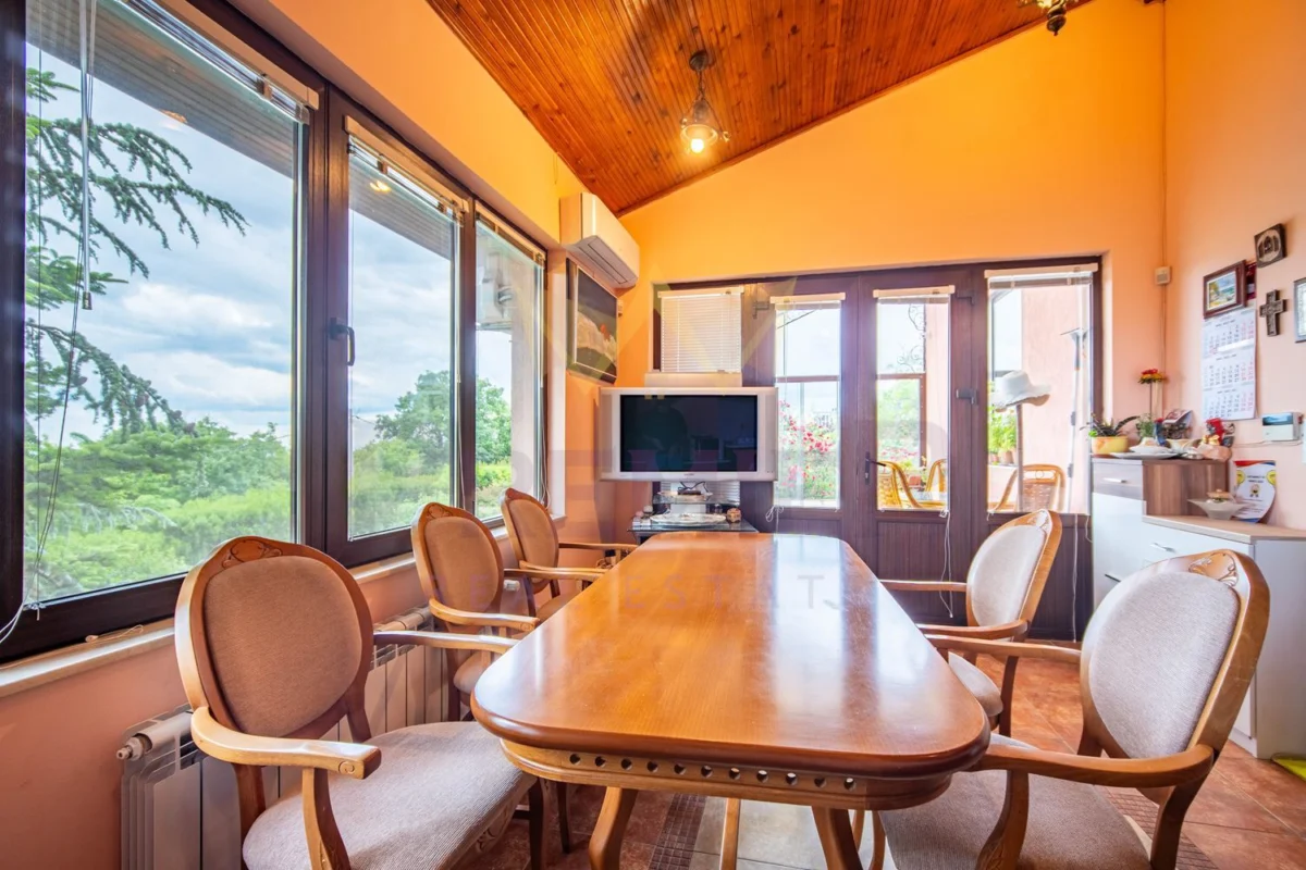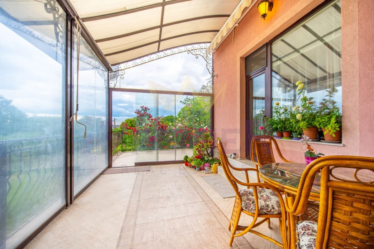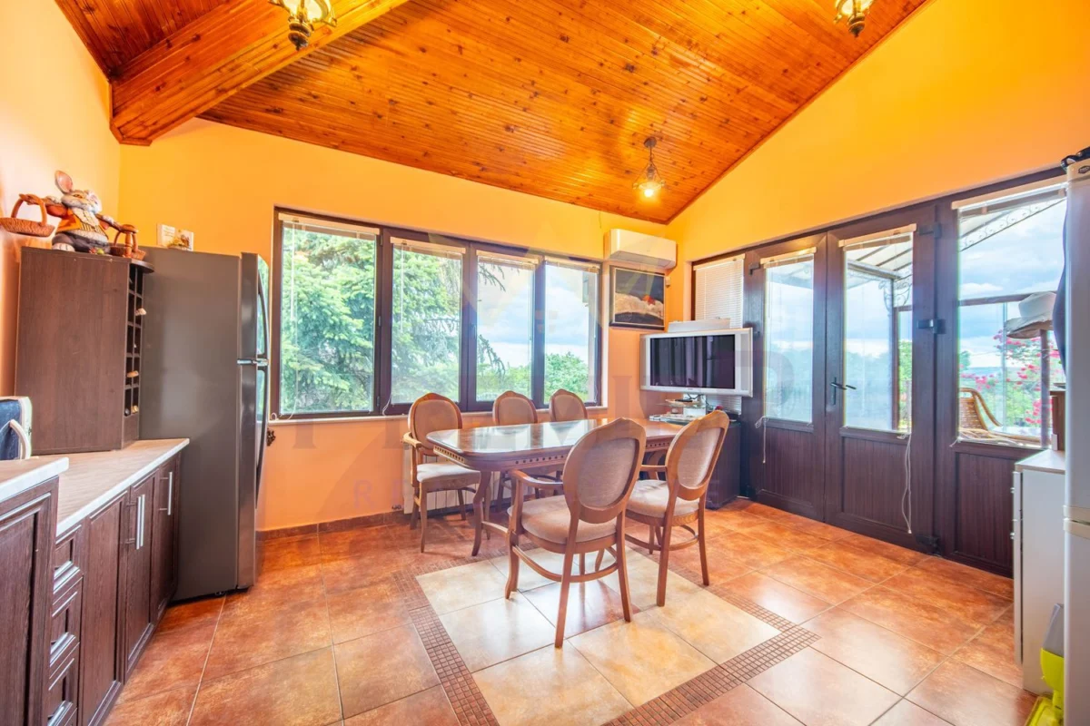 На първия етаж можете да откриете входно антре, голяма дневна зона, обединяваща хол, кухня и трапезария, както и закрита веранда с лятна кухня и прекрасна градина. Подовите настилки са гранит и паркет, които придават уют и топлина на пространството.