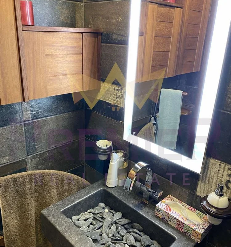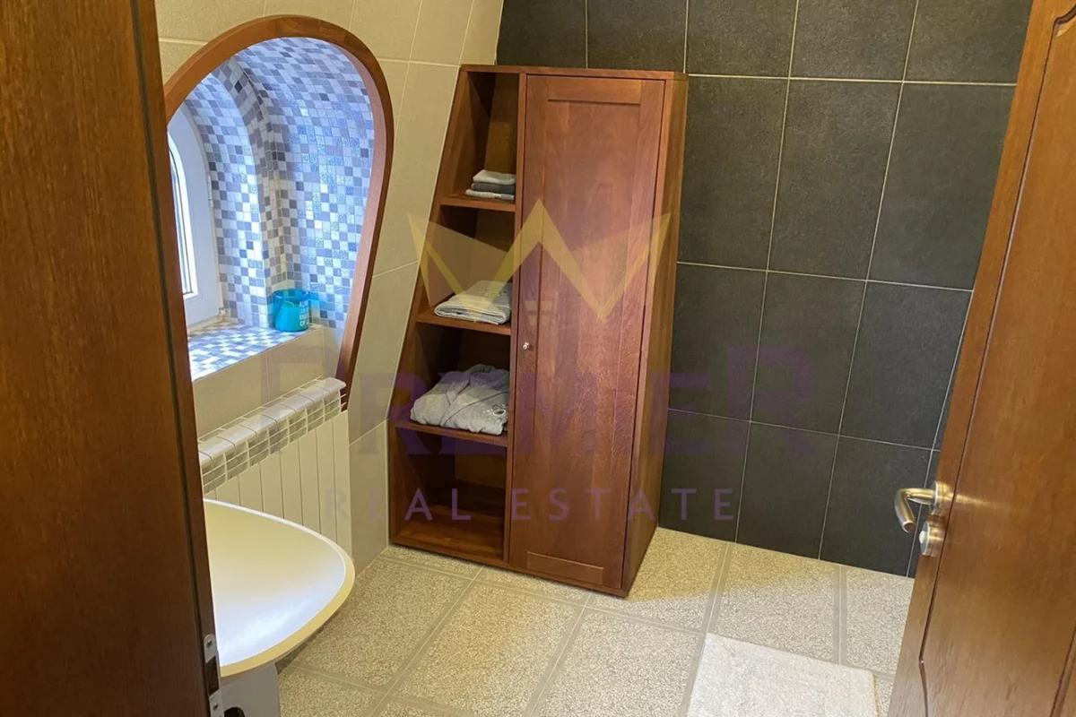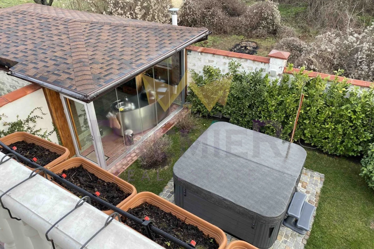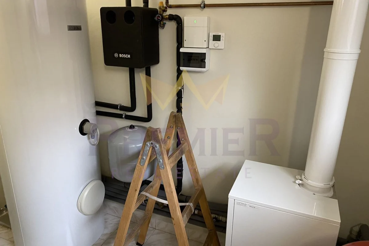 При обзавеждането на къщата е помислено за всичко – всеки малък детайл е изпълнен с дизайнерски подход и изключителна прецизност, използвани са основно естествени материали от най-висок клас като топола, дъб, естествен камък и др. Къщата е газифицирана, а също така разполага и със соларни панели на покрива.