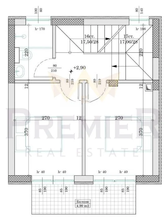 Етаж 2: баня с тоалетна, две спални и общ балкон.