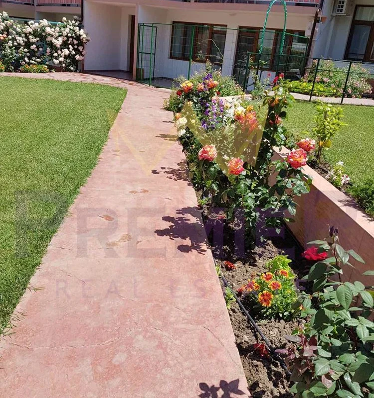 Към сградата има общи паркоместа. Поддържени са озеленени градини и зелени площи, басеин и обособена барбекю зона.