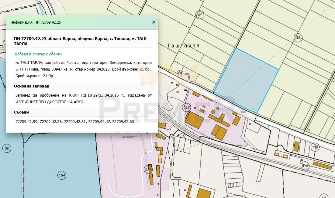 Имоти Премиер предлага на вашето внимание парцел с обща площ 38 947 кв.м., находящ се в местност „Таштарла“, землището на село Тополи, община Варна, област Варна. Имотът представлява земеделска земя (или: терен, подходящ за промишлено / логистично / строително развитие – в зависимост от предназначението), разположен на основната пътна артерия, свързваща с. Тополи с гр. Варна и индустриалната зона.