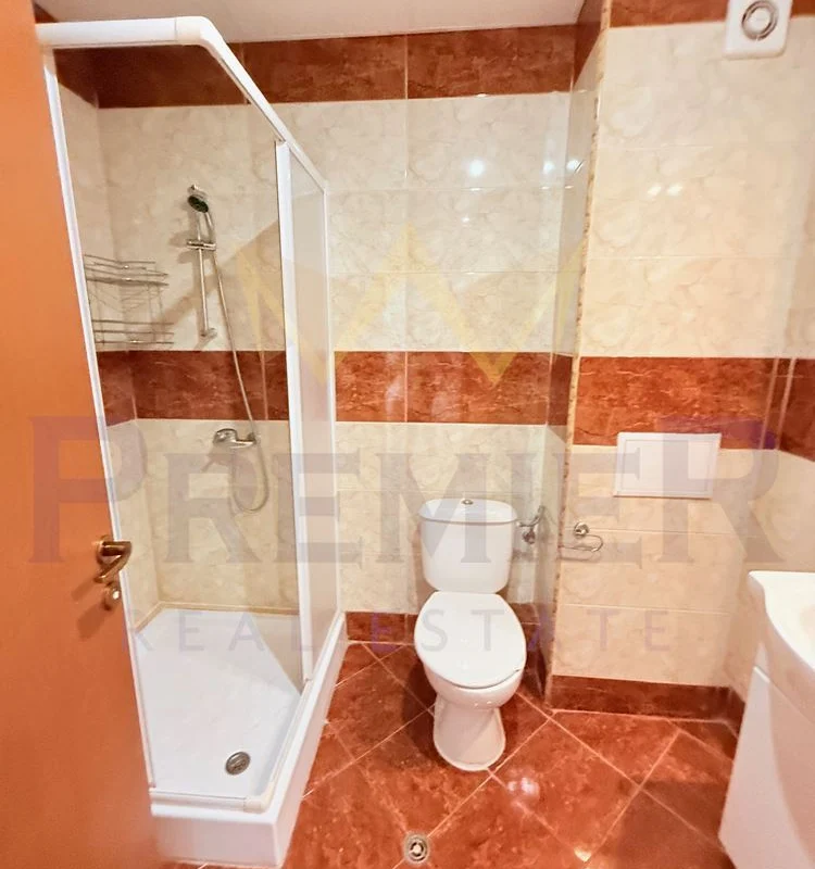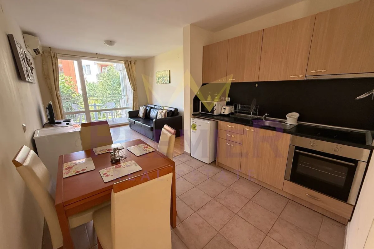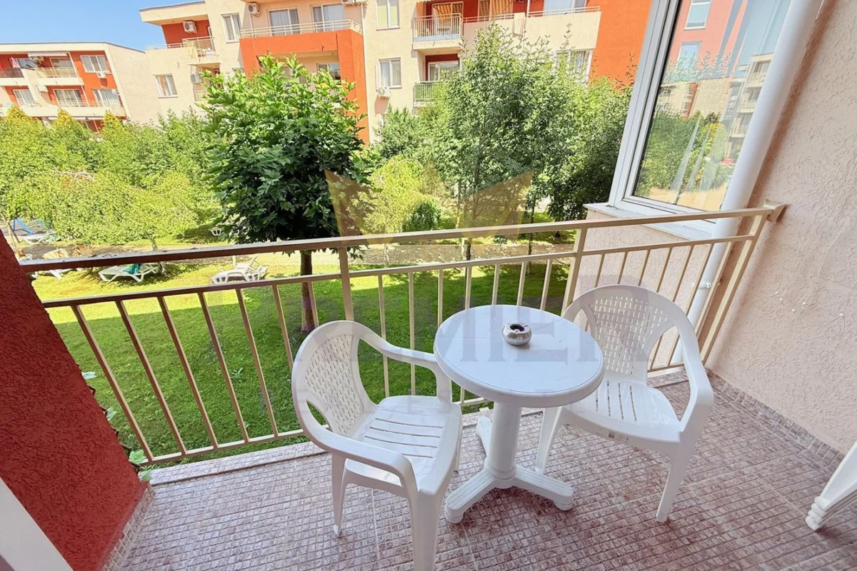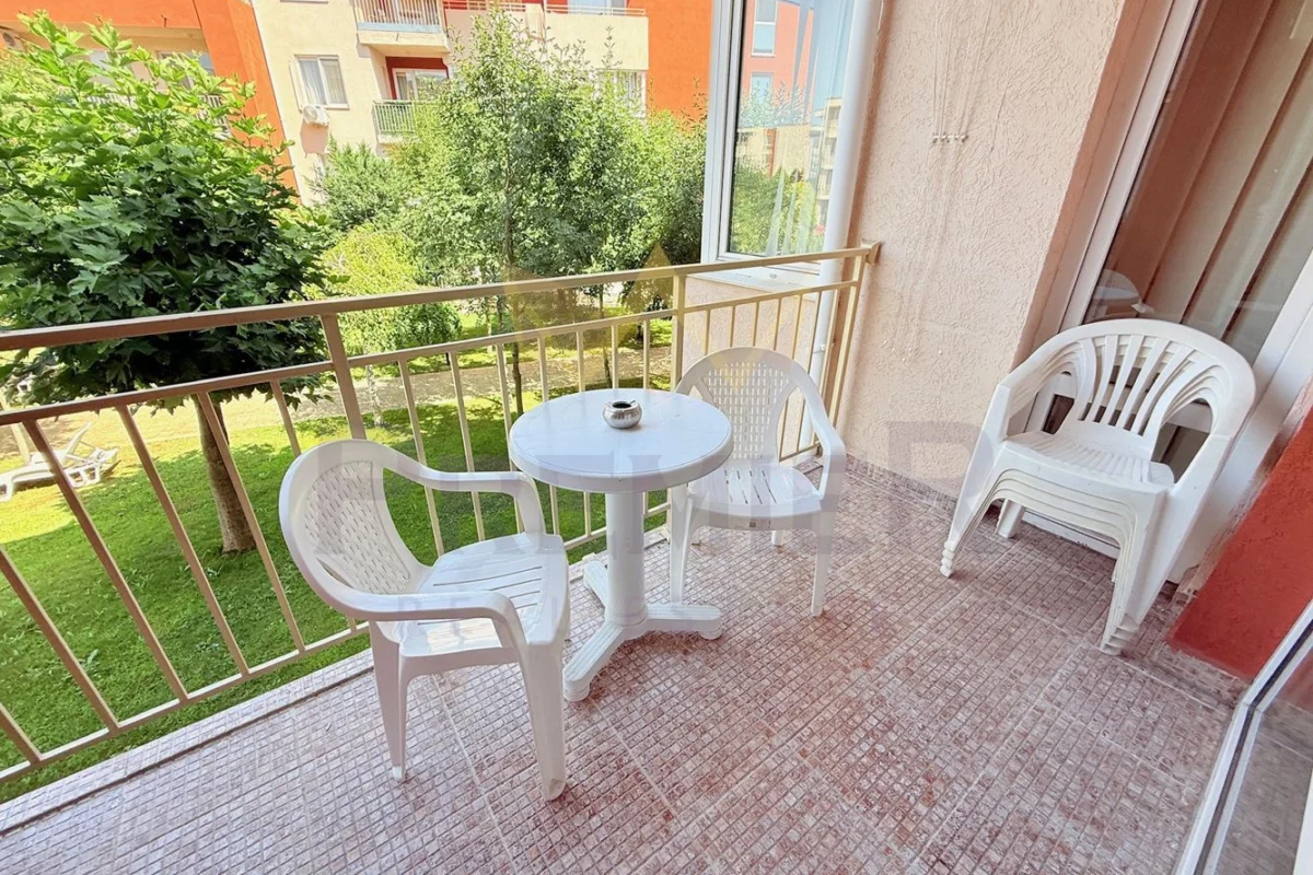 - Комфорт и удобства в апартамента: климатик във всяка стая, локално отопление, отделен електромер, входно антре, светъл хол с кухненски бокс, две спални, просторна тераса с гледка към озеленен двор и басейн, баня с тоалетна и отделна тоалетна.