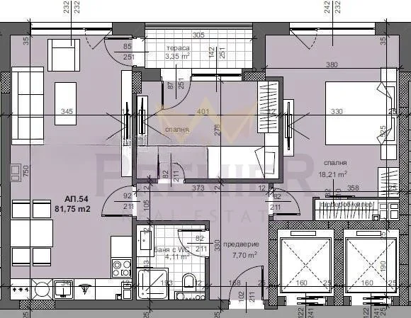 Разпределение: дневна с кухня и трапезария 25.87 кв.м спалня 1 18.21 кв.м, спалня 2 11.15 кв.м, баня с тоалетна 4.1 кв.м, предверие/антре 7.7 кв.м, тераса 3.35 кв.м