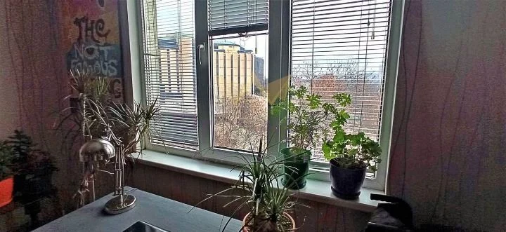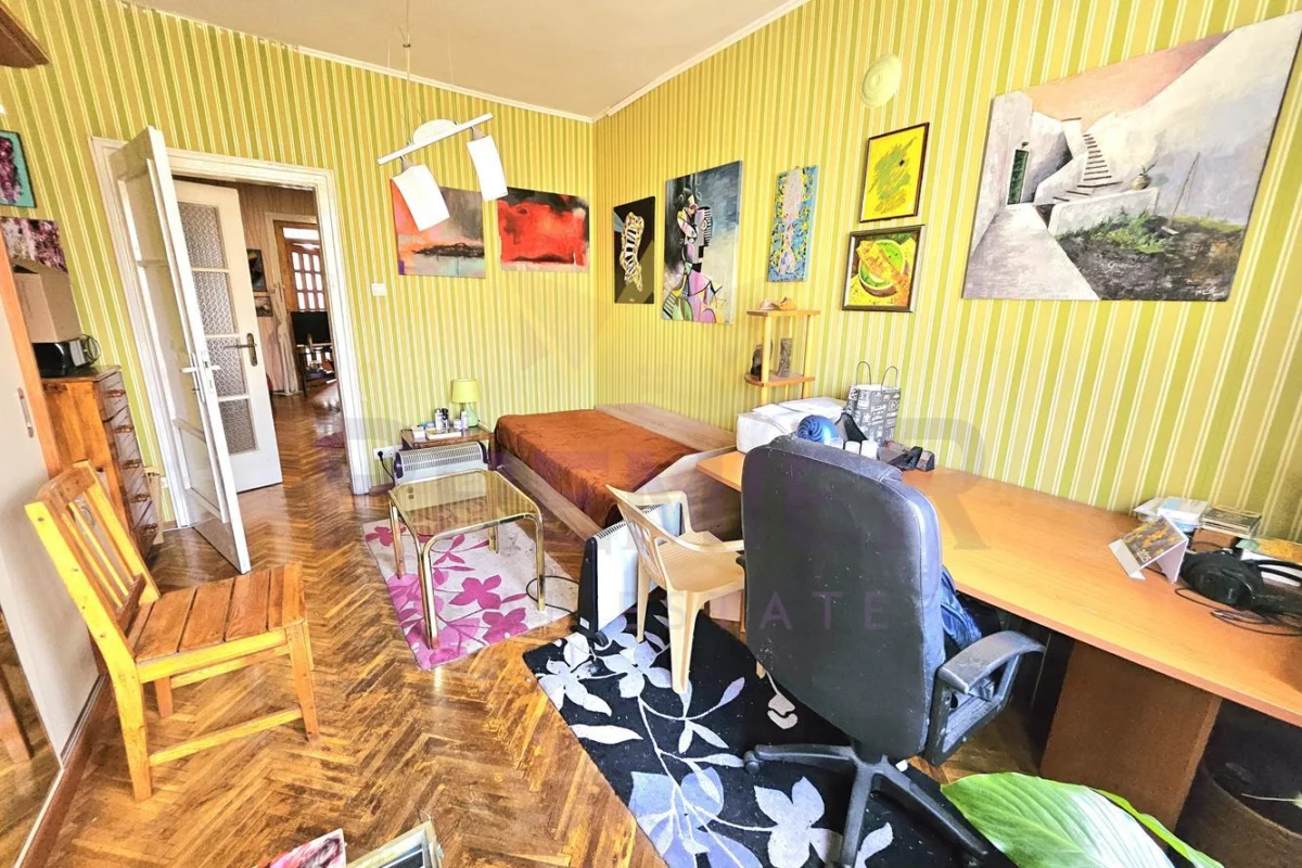 Апартаментът се намира на петия етаж (под таванските помещения) и предлага панорамна гледка – на изток към градинката на НДК и на запад към вътрешния двор на сградата.