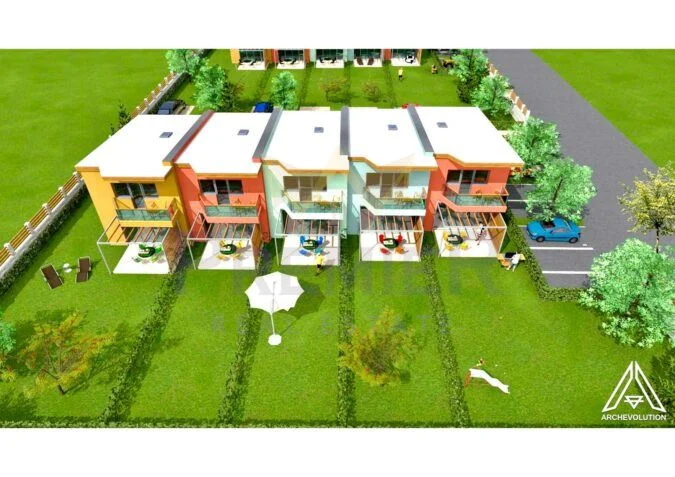Имоти Премиер предлага на Вашето внимание еднофамилни двуетажни къщи в затворен Немски Комплекс- с. Бенковски на цени от 690евро на кв.м. Строят се по немски проект и стандарт и ще бъдат завършени до ключ. Върху парцел с обща площ от 4000кв.м., ще бъдат изградени три реда с по пет къщи от тип редови с тераси, собствени дворове и паркоместа към всяка къща. Изключително подходящи за целогодишно обитаване, както и за сезонно ползване. Комплекса се намира само на 16км. от гр. Варна . Към момента е изграден първи ред с одобрен акт 14, на етап завършен груб строеж, завършен плосък покрив изолиран с 15см. топлоизолация и покрив с ПВЦ мембрана, поставена е дограма – немска 6 камерна с енерджи стъкла, покривни прозорци VELUX с електрическозадвижване за комфорт на обитателите и външна топлоизолация с дебелина 14см.